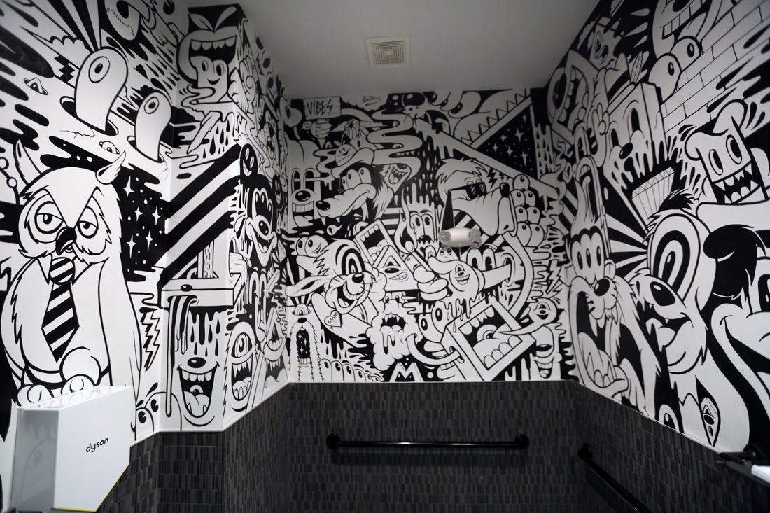 Whatever Mike winds up doing, it often results in the creation of a new art work. It might include turning a building’s windows into the eyes of a character’s face or creating a bit of an optical illusion for drivers speeding by. And he doesn’t limit himself to exteriors: His work has also covered cars, skateboards and bathroom walls. Just head north to Alpharetta’s new Holmes restaurant and check out his handiwork in the men’s and women’s bathrooms. It took two weeks for his bold brushstrokes to fill the spaces where they beg to be examined, which is sure to make the lines longer as people linger inside.