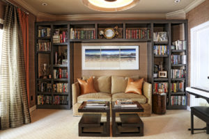 The comfort is reflected in the furniture in the family room, which includes a Mitchell Gold+ Bob Williams chenille couch and Bernhardt chair with a neutral linen on the outside and a woven chocolate fabric on the inside. The library also contains comfortable furniture, with its Duralee sleeper sofa and Century cocktail tables.