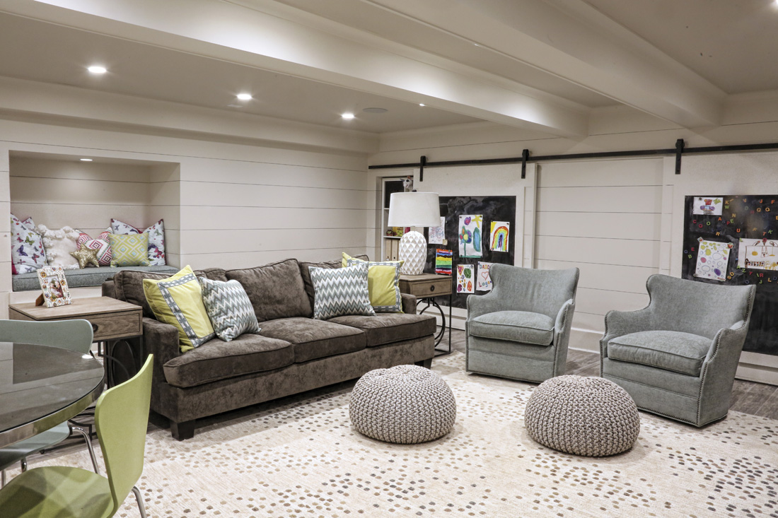 The basement features Logan’s playroom, complete with plenty of storage behind the barn-style doors.